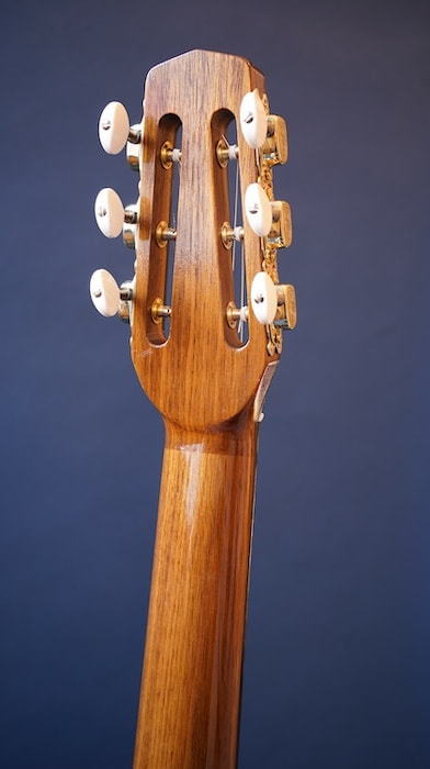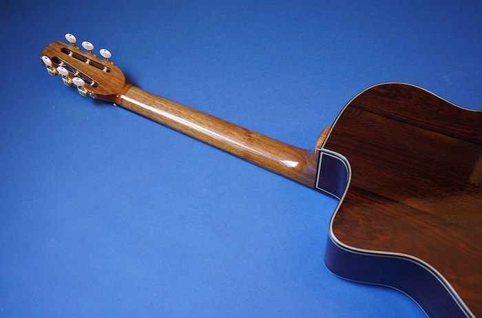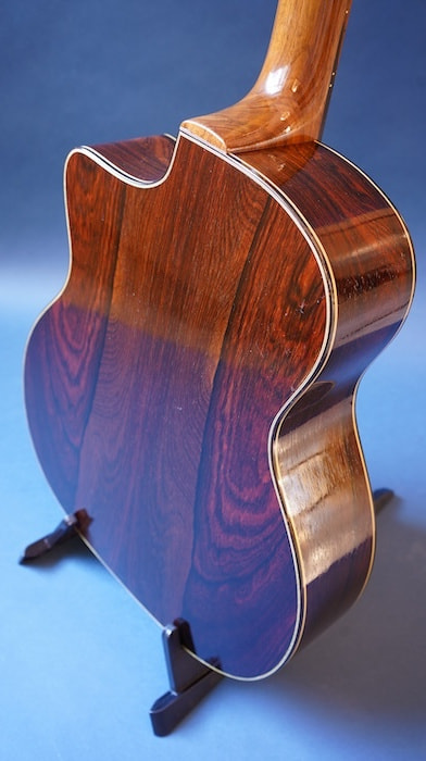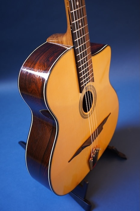 サイド&バックのハカランダはもちろん、トップにはAAAAグレードのアディロンダック・スプルース単板を、指板には独特の動きのある木目が特徴的なマッカーサー・エボニーをそれぞれこのモデルのためにチョイス。さらにペグには今となっては入手不可能なスイスのMiller社製のセルマーレプリかチューナーをインストール。どこに出しても恥ずかしくない、ヨーロッパ人ビルダーキラーな一本として、メイドインジャパンのプライドを持って完成いたしました。
