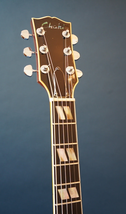 17インチ弱のやや大きめなボディにレアなベネチアン・カッタウェイを搭載した京都Chaki製のピックギターです。