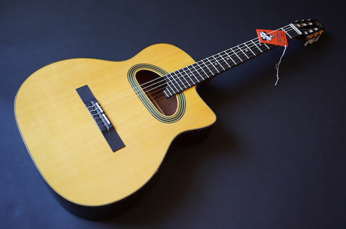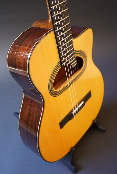 フィンガーピッキングではナイロン弦らしい甘いサウンド、フラットピックでハードに弾くとマカフェリらしいジプシーサウンド、一粒で二度美味しいキャラクターを持ち合わせた一本です。