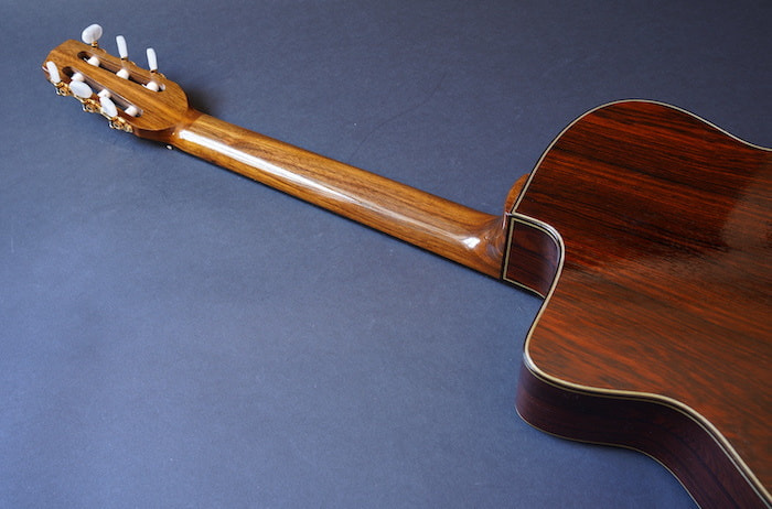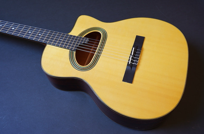 スティール弦仕様のマカフェリとは全く違う内部構造を持ち、通常のクラシックギターよりも細い48mmのナット幅を採用し演奏性を向上させ、ジプシージャズだけでなくあらゆるアコースティック・ミュージックに対応できるようにしています。