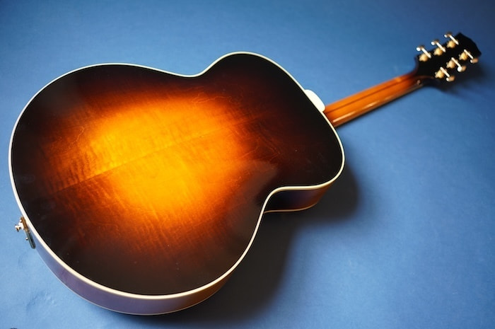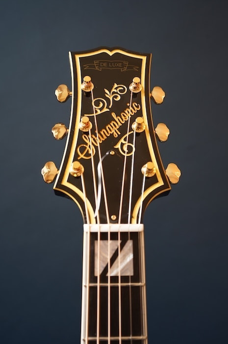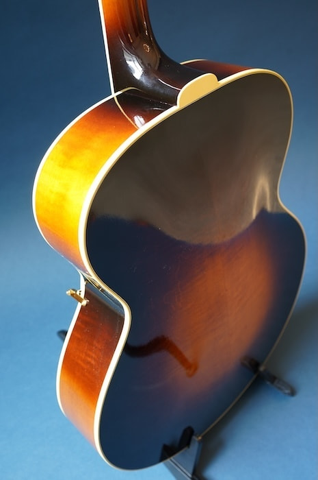 構想から3年、ファーストサンプル、セカンドサンプルと2種類の試作を経て市販モデルが完成しました。テールピースやブリッッジ、ピックガードなどのパーツは全てこのギター専用にイチから作り、使用する材にはスプルース削り出しトップ、メイプル単板サイド&バックをチョイス。戦前D'Angelicoスタイルの17インチボディに、特徴的なゴージャスなヘッドストックを持った当店オリジナルギターの最高級モデルです。