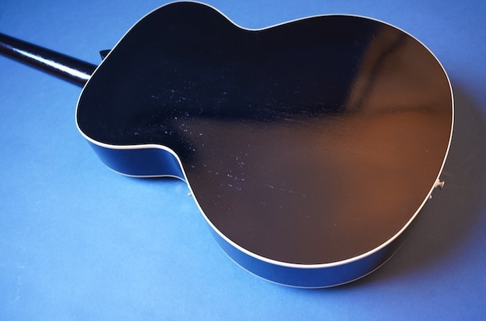 トップのみ単板ですが、ラッカー極薄塗装やXブレイシング採用など、生の鳴りは決して上位モデルと遜色ないレベルで、アコースティックに鳴らすブルースやオールドジャズに、さらに指板エンド部にはフローティングピックアップを後付け出来るようにスペースを確保しておりますので、お好みのピックアップを取り付けてモダンジャズに、名前の通りジャズ〜ブルースにとガンガン使うために、今や観点に手が出せなくなって来たL-48やL-50の、