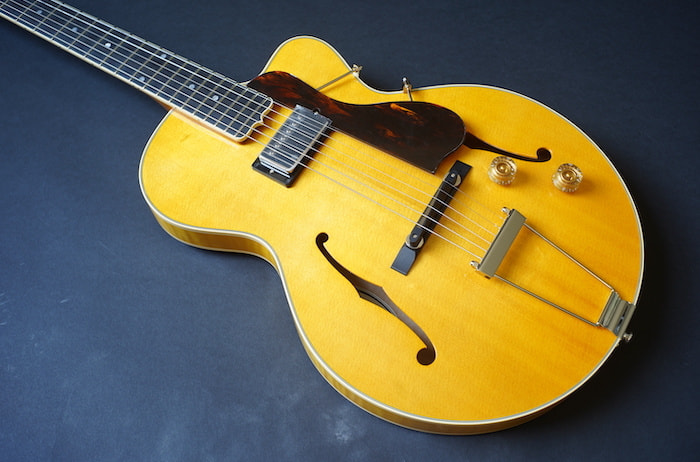 当店オリジナルのハンドメイド・ハムバッカー(大阪で作ってます!)を、1950年代後半のPAFっぽいジャズ向きな甘いサウンドにチューニングし搭載。重量はわずか1.75kg。最軽量クラスのマカフェリとほとんど変わらないフェザー級のギターです。