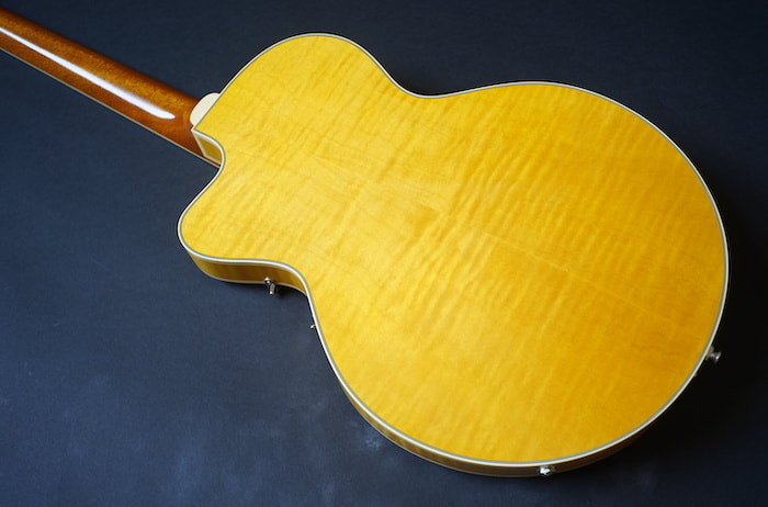 また、小ぶりだけど十分強度を兼ね備えた薄めの合板ボディをこのギター用に専用設計、完全なアコースティックモデルほどではないにせよ、ハウリング耐性を高めながら十分な生音も出せるように工夫してあります。ラウンド弦で生音をミックスして鳴らすもよし、フラットワウンド弦でピュアなジャズサウンドを楽しむもよし。守備範囲の広い一本としてライブやレコーディングなどに活躍できることでしょう。