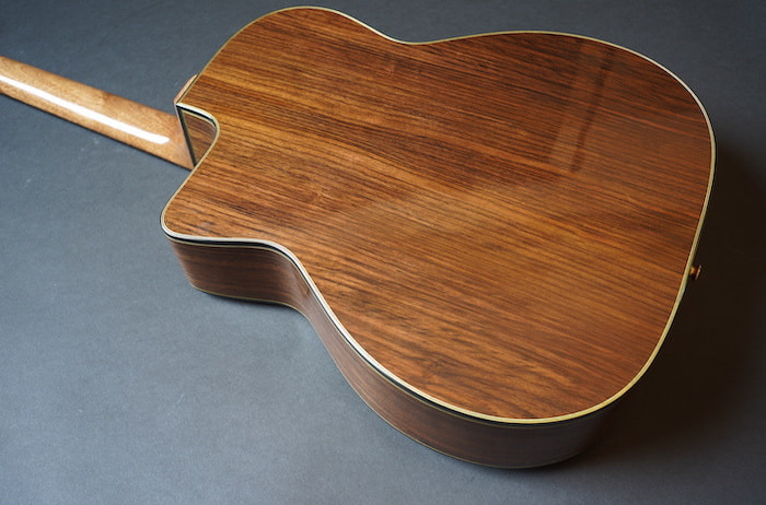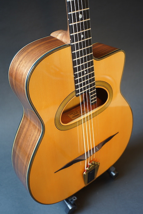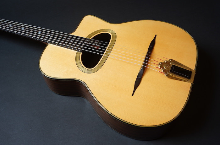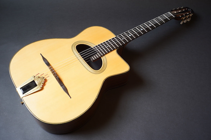 ボディ内部にもう一部屋あるからといってボリュームが倍になるわけではないので過度な期待は禁物ですが、リゾネーターが持つ独特なフェイズがかかったサウンドで、12フレットジョイントのパワフルなサウンドと相まって、戦前マカフェリのレトロっぽい雰囲気がうまく再現されています。
