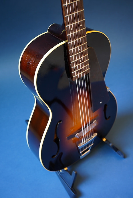 サイズ的にはシングルOタイプの超小型ボディをアーチトップ化。バックはフラットにし、極薄のラッカー塗装にすることで小ぶりながら豊な生音を生み出し、超軽量でホールドしやすい絶妙のサイズ感を持ったギターになっています。