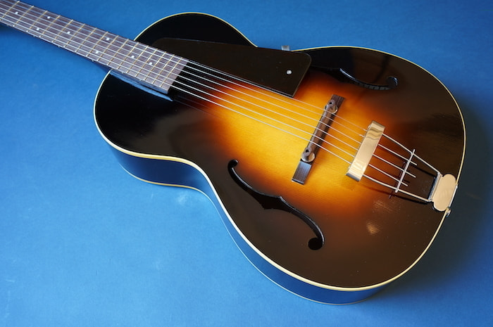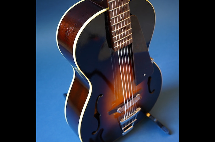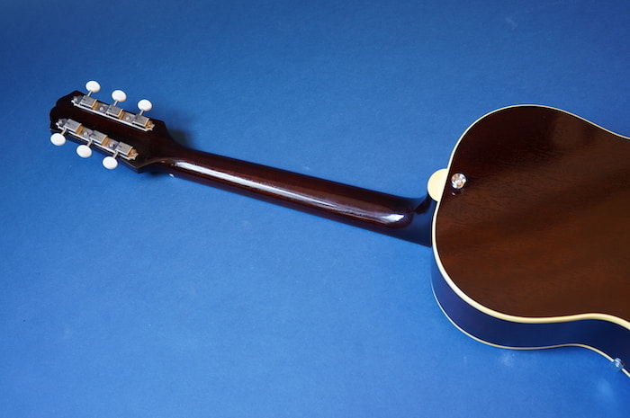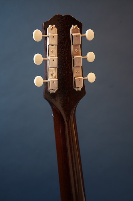 こちらはピックアップなしの完全アコースティック・バージョンな一本。戦前ギブソン同様にフラットバック仕様のおかげか、この小ぶりなボディの割に生音は豊かに鳴ります。指板エンド部には十分な隙間があるため、お好みピックアップと組み合わせてエレキ化するのもいいかも。