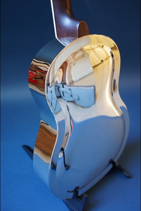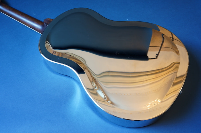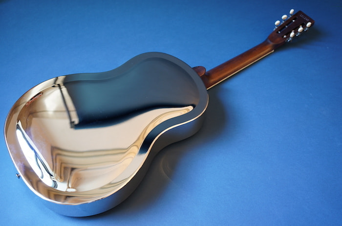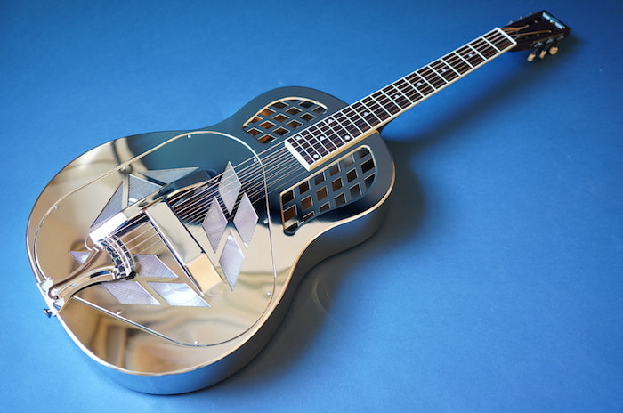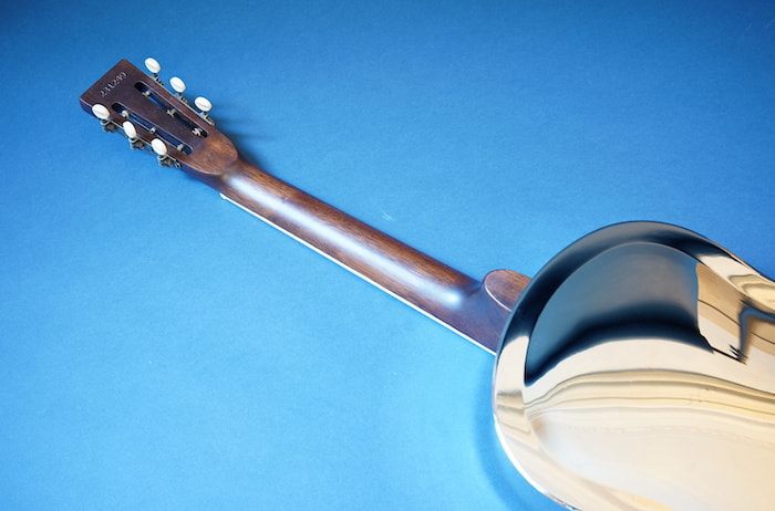 今回入荷の一本はメタルボディリゾネーターの最高峰、トライコーンモデル。戦前から定番人気のニッケルメッキされたブラスボディです。適度に握りやすく厚みのあるネックシェイプ。オリジナル・アルミニウム・コーンを搭載しており、ビンテージにありがちな華奢な鳴りとは全く違う、ラウドかつパワフルな骨太モデル。