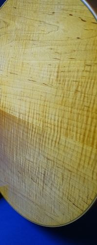 削り出し単板トップ、トラ杢バリバリのハードメイプル単板サイド&バックを使用した限定版です。