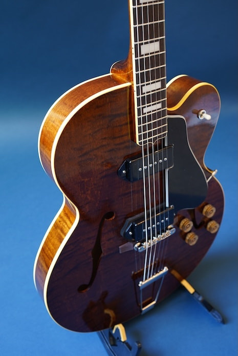 立っての演奏ならフルデプスよりもこちらの方が圧倒的に使いやすいです。こちらは2PU仕様のTwo Bone。このモデル用にチューニングされたハンドワイアリングのP-90タイプを採用。ブリッジ下にはハウリング防止とレスポンス向上のためにスプルースのブロックを圧着。多少のドライブサウンドならハウることなく粘ってくれます。もちろん甘いジャズトーンもしっかりと再現。ダーティーなだけじゃない幅広いプレイヤーに使っていただける一本。