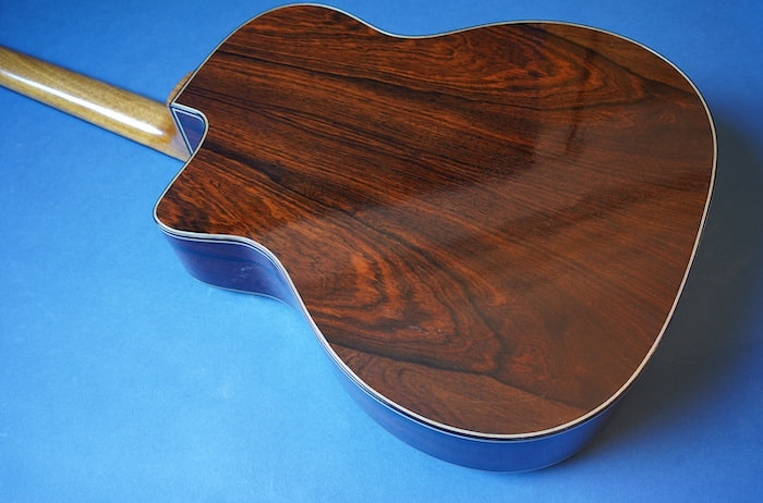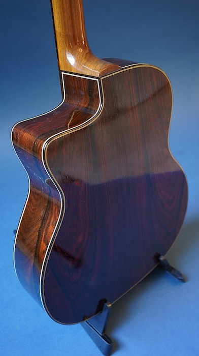 爆音という言葉が最も似合うアコースティックギターかもしれません。中低域の重厚感はマカフェリモデル随一で、最強のリズムギターにしてハイポジションまでストレスなく使えるソロギターでもある究極の一本。