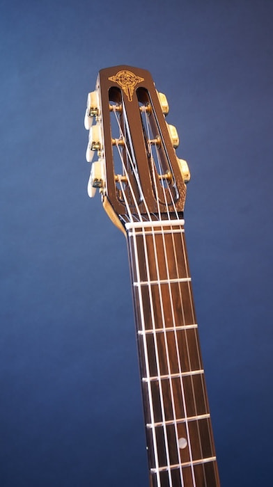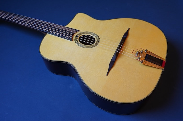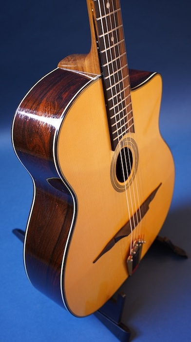 アディロンダック・スプルースの持つパワフルな中低域と抜けの良い高音域、ジプシーギターらしい立ち上がりの早いサウンドキャラクター、1960年代から50年以上この日本にストックされていたハカランダが持つ茶色と黒のコントラストが美しい木目、マッカーサーエボニーのうねる様なエキゾチックな木目と、今やプレミア物となったMillerのセルマーレプリカチューナーetc...もちろんオリジナルセルマー同様の特殊なヘッドジョイントやベンド・トップも完全再現。とくかく詰め込めるものは詰め込んだまさに"全部入り"の当店最高峰モデルです。弾き込めばさらにパワフルさは増して来ます。国内外問わず積極的に持ち出して弾き倒して欲しい一本です。