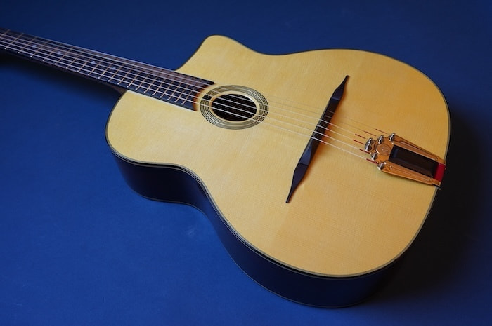サイド&バックのハカランダはもちろん、トップにはAAAAグレードのアディロンダック・スプルース単板を、指板には独特の動きのある木目が特徴的なマッカーサー・エボニーをそれぞれこのモデルのためにチョイス。さらにペグには今となっては入手不可能なスイスのMiller社製のセルマーレプリかチューナーをインストール。どこに出しても恥ずかしくない、ヨーロッパ人ビルダーキラーな一本として、メイドインジャパンのプライドを持って完成いたしました。