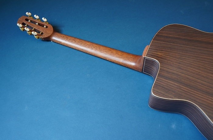 ペグはオリジナルセルマーのレプリカです。ナット幅は45mm、スケールは670mmで、このあたりもジプシーギターの王道のスペックを踏襲。