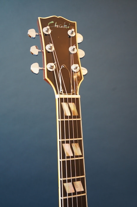 17インチ弱のやや大きめなボディにレアなベネチアン・カッタウェイを搭載した京都Chaki製のピックギターです。