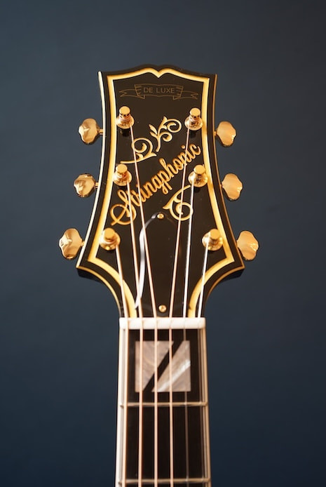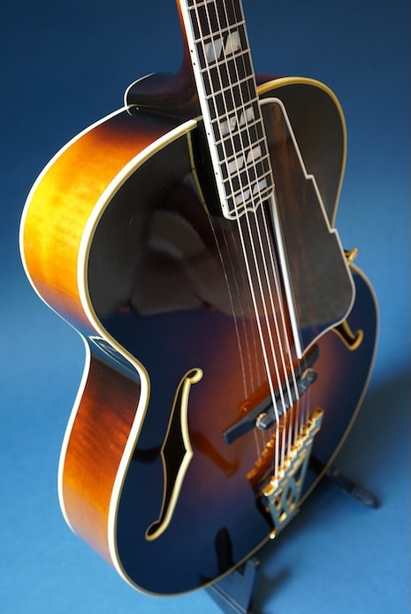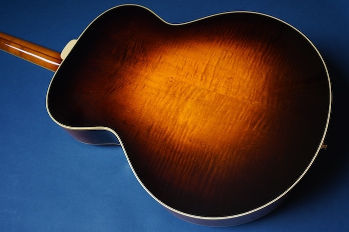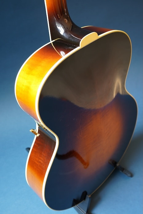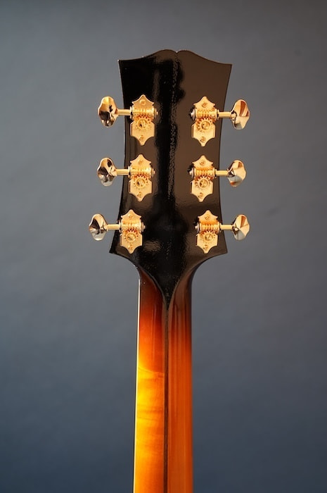 構想から3年、ファーストサンプル、セカンドサンプルと2種類の試作を経て市販モデルが完成しました。テールピースやブリッッジ、ピックガードなどのパーツは全てこのギター専用にイチから作り、使用する材にはスプルース削り出しトップ、メイプル単板サイド&バックをチョイス。戦前D'Angelicoスタイルの17インチボディに、特徴的なゴージャスなヘッドストックを持った当店オリジナルギターの最高級モデルです。