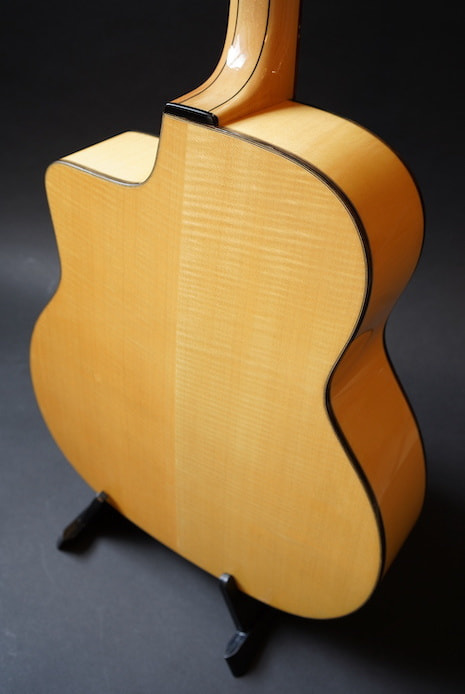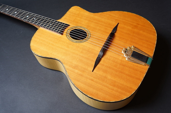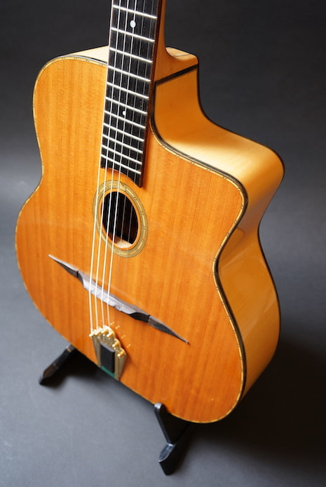 アジアン・メイドのDell' Arte ブランドのうち、このひとまわり大きなボディを持つFavinoスタイルのアンジェロ・デバーレ・モデルだけは、ビンテージのFavinoによく似ているキャラクターを持っていて、絶妙にコンプのかかった生音がなんともオールドライクな雰囲気を醸しており、ルックスもしっかりコピーされているなかなか侮れない一本です。