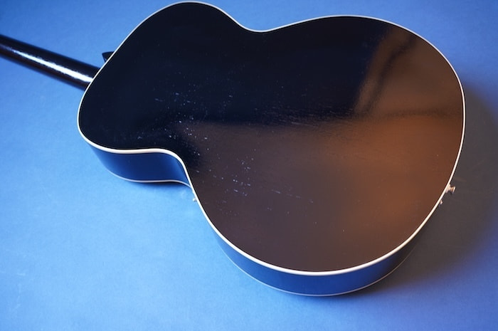 トップのみ単板ですが、ラッカー極薄塗装やXブレイシング採用など、生の鳴りは決して上位モデルと遜色ないレベルで、アコースティックに鳴らすブルースやオールドジャズに、さらに指板エンド部にはフローティングピックアップを後付け出来るようにスペースを確保しておりますので、お好みのピックアップを取り付けてモダンジャズに、名前の通りジャズ〜ブルースにとガンガン使うために、今や観点に手が出せなくなって来たL-48やL-50の、