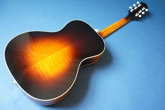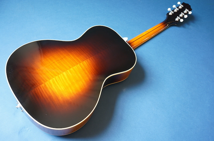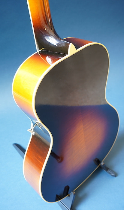 本家ギブソンの戦前にのみ存在したスモール・アーチトップの人気モデルL-37を元に、オール単板ボディに極薄ラッカー塗装、フラットバック、Xブレイシング・トップを採用し、レイズド・フィンガーボード(指板がトップからせり上がった形状)仕様にして、生音を最大限生かしつつも指板エンド部にはフローティングピックアップを増設出来るように配置しています。