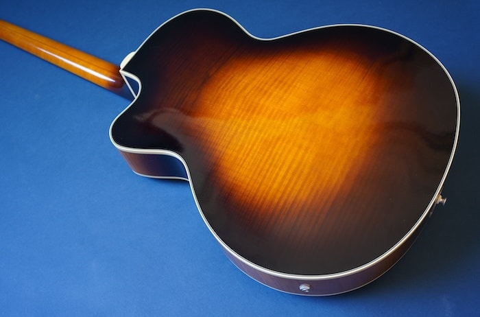 今から約10年前に企画し、12本のみ生産した当店オリジナルのフルアコベースです。16インチボディのフルアコLang-Cをミディアムスケールのベースとして、フレットレス、フレット付きでリリース。こちらはフレット付きでつくらえた6本のうちの一本になります。