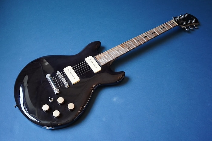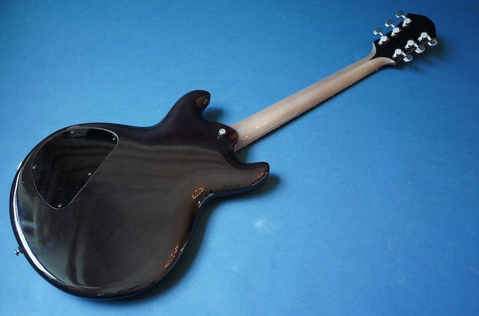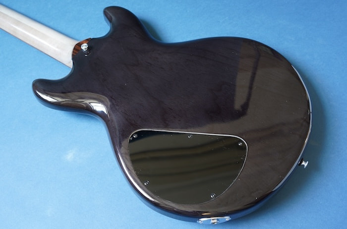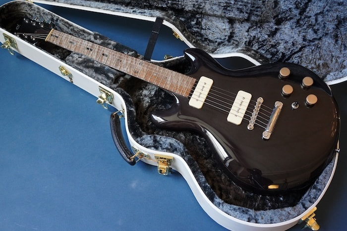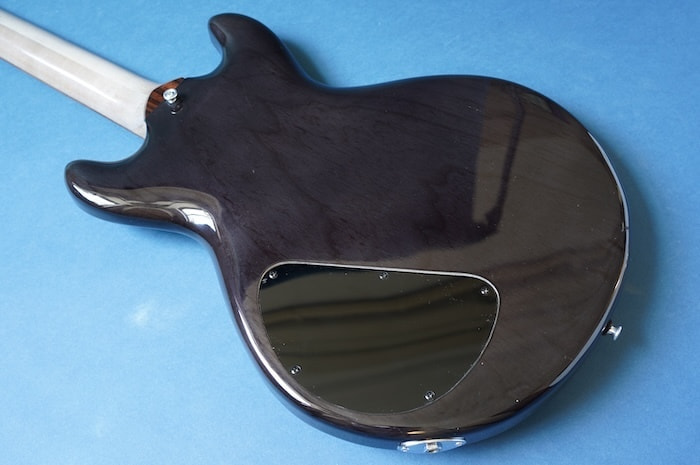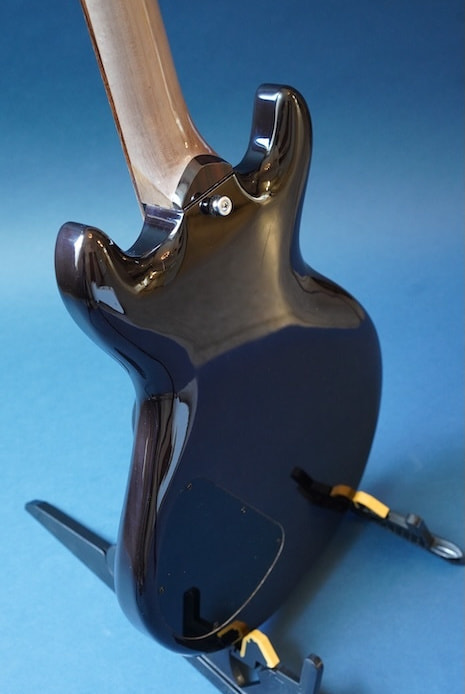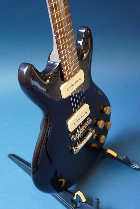ボディはライトアッシュ材と思われ、ネックはメイプル(だと思います)で、指板には彼が好んで使用していた北海道の希少材であるトラ杢入りのイタヤカエデではないかと思われます。塗装はセラックではないかと思われますが、細かい詳細は不明です。ピックアップはダンカンP90タイプ。