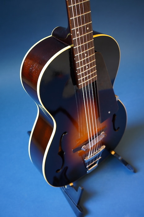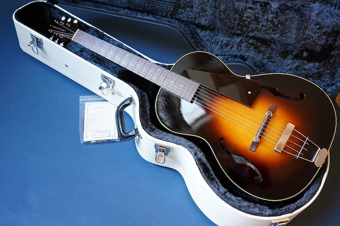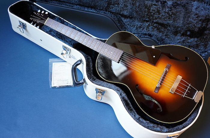 サイズ的にはシングルOタイプの超小型ボディをアーチトップ化。バックはフラットにし、極薄のラッカー塗装にすることで小ぶりながら豊な生音を生み出し、超軽量でホールドしやすい絶妙のサイズ感を持ったギターになっています。
