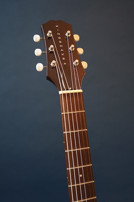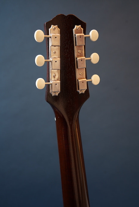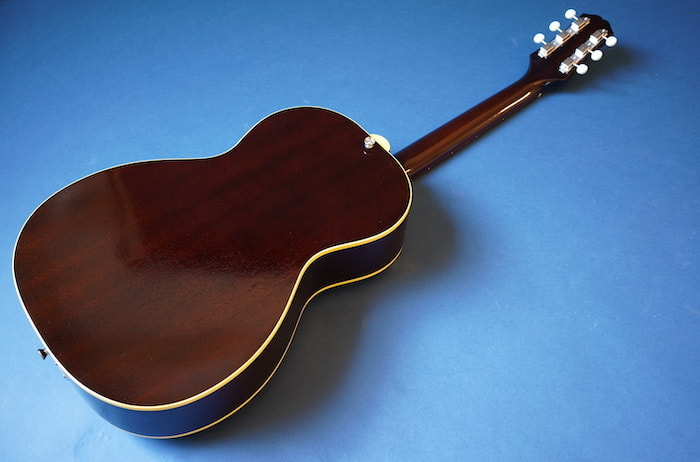 こちらはピックアップなしの完全アコースティック・バージョンな一本。戦前ギブソン同様にフラットバック仕様のおかげか、この小ぶりなボディの割に生音は豊かに鳴ります。指板エンド部には十分な隙間があるため、お好みピックアップと組み合わせてエレキ化するのもいいかも。