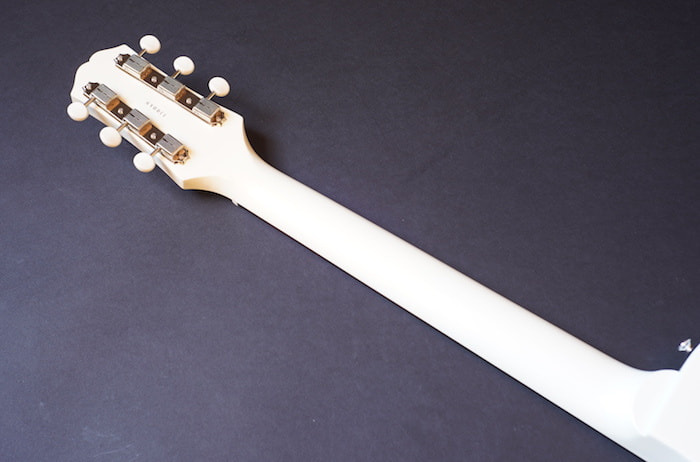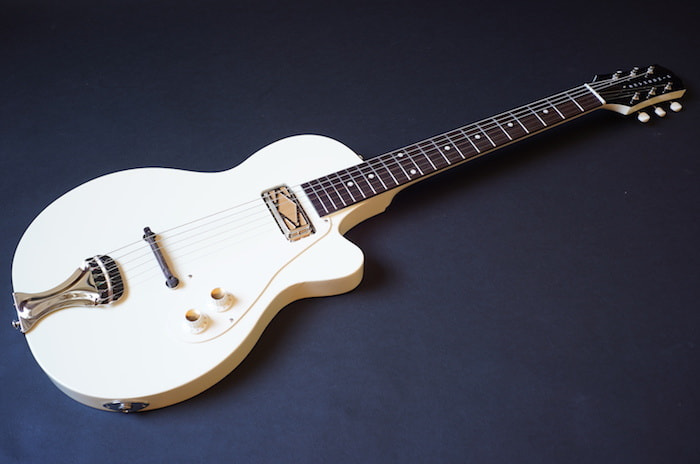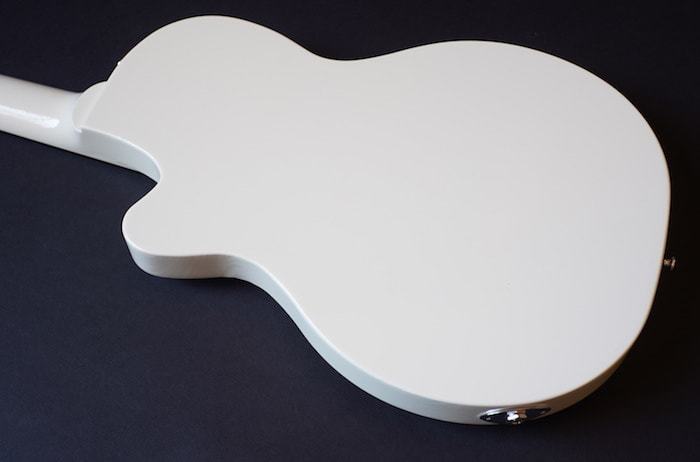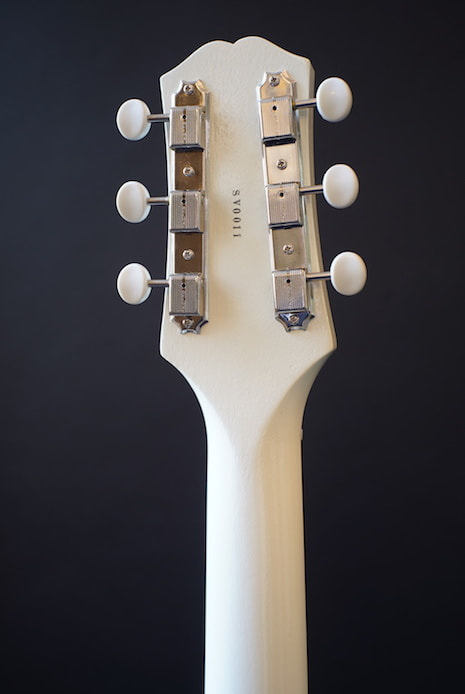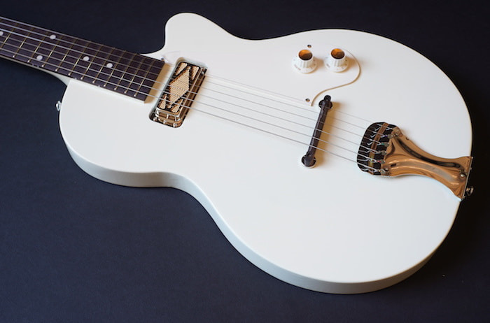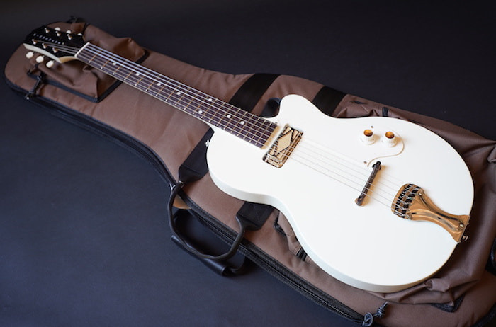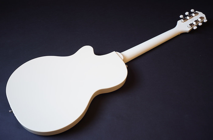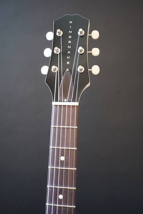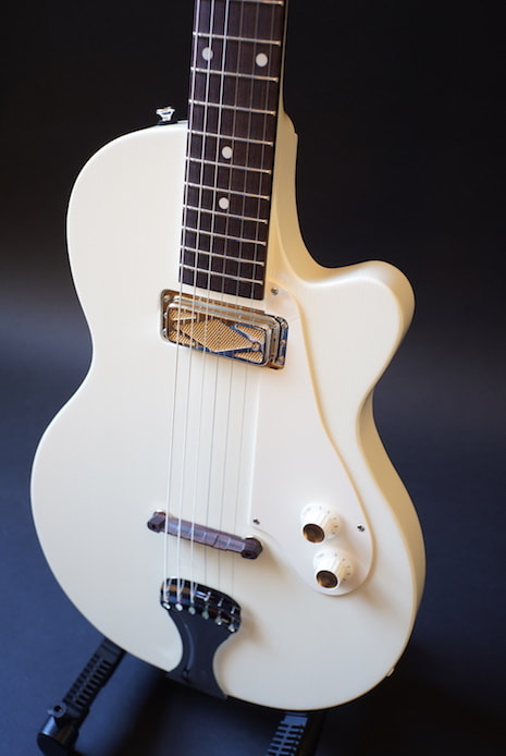 1950年代のKay K136のオマージュ的なルックスを持つKing Snakeのニューモデル、Soulville。スプルース系の材であるヘムロックを使用することにより、ソリッドでありながら意外にもよく鳴るボディを持ち、一見DeArmond Goldfoilピックアップを搭載しているかと思いきや、国内のハンドメイドメーカーでいちから設計した純国産ピックアップを搭載。ルックスはビザールでもしかりと考え抜かれ設計されたギターであることが伺えます。フロント1ピックアップ仕様ですのでサウンドバリエーションはありませんが、アンプ直で鳴らした甘いクリーントーン、さらにドライブさせてブルージーに、色々使い道はあります。アタマをフル回転させて使いこなしてください。
