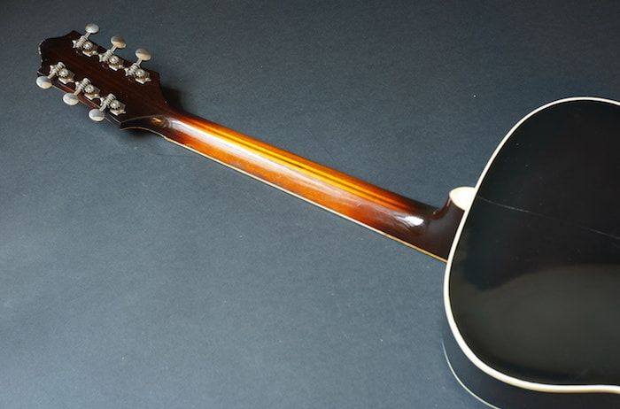 ボディ全体的にリフィニッシュされ、バックのセンター継ぎ目の剥がれをリペアしてあります。バインディング剥がれもなくネックもストレート、コンディションは上々です。